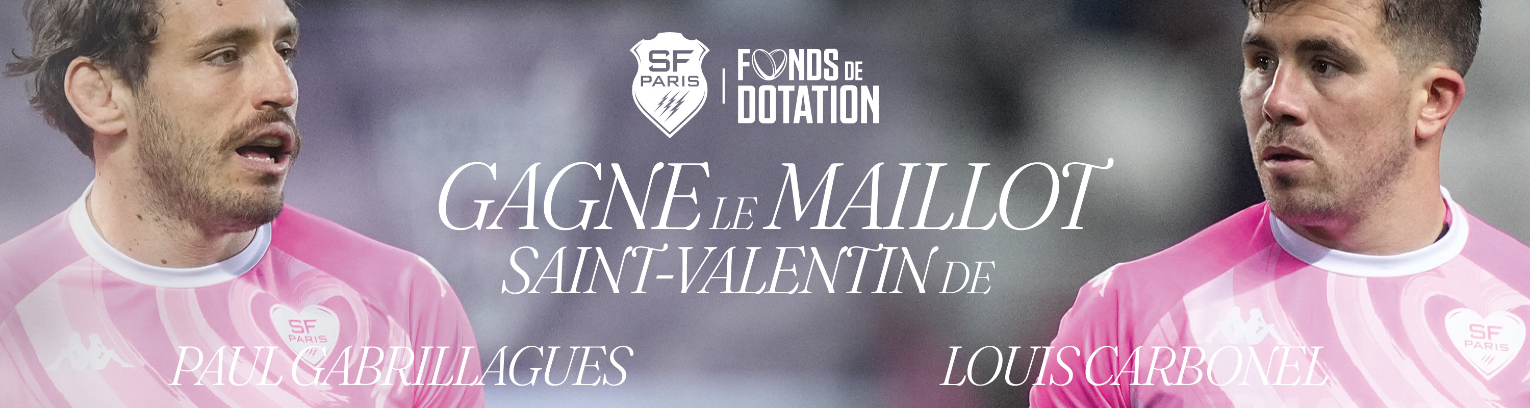 Deux maillots d’échauffement Saint-Valentin, portés et signés par Paul Gabrillagues et Louis Carbonel lors de l’échauffement du match Stade Français Paris vs Stade Toulousain du 15 février.